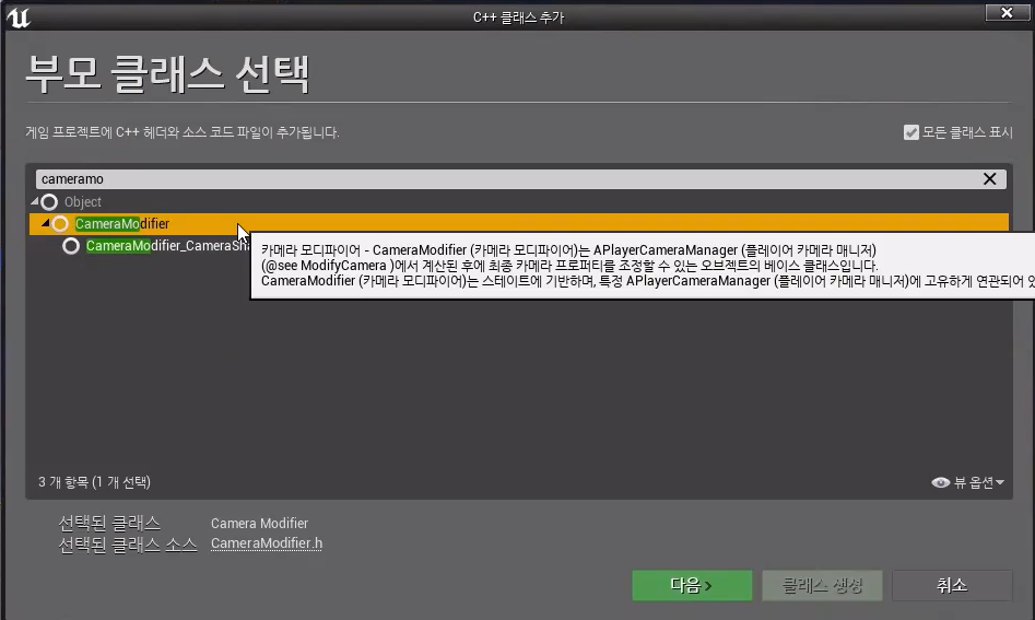 1. 상속받은 부모 UCameraModifier로 들어가서 Override할 함수를 가져와서 사용할 것이다.